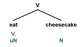 In some variants of the Minimalist Program Merge is triggered by feature checking, e.g. the verb eat selects the noun cheesecake because the verb has an uninterpretable N-feature [uN] ("u" stands for "uninterpretable"), which must be checked (or deleted) due to full interpretation.[6] By saying that this verb has a nominal uninterpretable feature, we rule out such ungrammatical constructions as *eat beautiful (the verb selects an adjective). Schematically it can be illustrated as: