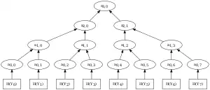 With these hash values a hash tree is built, by placing these hash values as leaves and recursively hashing to form a binary tree. Let denote the node in the tree with height and left-right position . Then, the hash values are the leaves. The value for each inner node of the tree is the hash of the concatenation of its two children. For example, and . In this way, a tree with leaves and nodes is built.