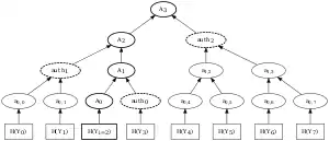 Merkle tree with path A and authentication path for i = 2, n = 3