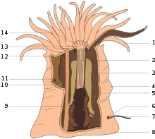 In the phylum Cnidaria and the class Anthozoa, the mesenteries are sheet-like partitions that extend from the body wall of the animal into its gastrovascular cavity. They are composed of a layer of mesogloea sandwiched between two layers of gastrodermis. They can either be "complete", joining the gastrodermis of the body wall with that of the pharynx, or "incomplete", extending only part way into the cavity (the terms "perfect" and "imperfect" are sometimes used instead). They stretch from the pedal disc to the oral disc, and there are two perforations or ostia near the oral disc. Mesenteries are usually in pairs. The free edge of incomplete mesenteries are thickened to form glandular, ciliated bands called mesenterial filaments. The lower ends of the mesenterial filaments are elongated into acontia which are armed with cnidocytes (stinging cells) and can protrude through the body wall or mouth. The gonads are situated on the mesenteries alongside the mesenterial filaments.[5]