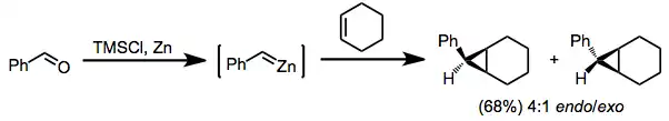Substituted zinc carbenoids can be prepared from the corresponding ketones or aldehydes through a sequence analogous to the mechanism of the Clemmensen reduction. Cyclopropanation of olefins with these intermediates occurs with moderate diastereoselectivity and yield.[27]