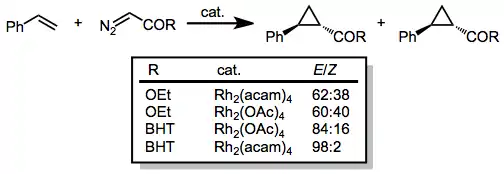 Diazoacetates that possess a single carbonyl substituent attached to the diazo carbon, have been used for the cyclopropanation of a wide array of olefins. Diastereoselectivity for the (E) cyclopropane increases as the size of the ester group increases. In addition, adding electron density to the catalyst (for instance by replacing acetate ligands with acetamide, acam) increases the diastereoselectivity of the reaction.[15]