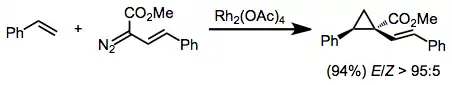 Metal-catalyzed cyclopropanations are chemical reactions that result in the formation of a cyclopropane ring from a metal carbenoid species and an alkene.[1] In the Simmons–Smith reaction the metal involved is zinc. Metal carbenoid species can be generated through the reaction of a diazo compound with a transition metal). The intramolecular variant of this reaction was first reported in 1961.[2] Rhodium carboxylate complexes, such as dirhodium tetraacetate, are common catalysts. Enantioselective cyclopropanations have been developed.[3]