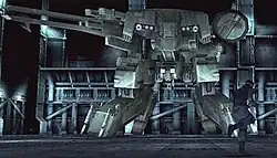 The characters and mecha designs were made by artist Yoji Shinkawa based on Kojima's concepts. According to Shinkawa, Solid Snake's physique in this particular installment was based on Jean-Claude Van Damme, while his facial appearance was based on Christopher Walken.[59][60] The characters were completed by polygonal artists using brush drawings and clay models by Shinkawa.[61] According to Kojima, "the ninja's cloaking effect is the result of a bug. Of course, it wasn't totally coincidence since we wanted that effect anyway, but we did get a somewhat unexpected result."[54] Kojima wanted greater interaction with objects and the environment, such as allowing the player to hide bodies in a storage compartment. Additionally, he wanted "a full orchestra right next to the player"; a system which made modifications such as tempo and texture to the currently playing track, instead of switching to another pre-recorded track. Although these features could not be achieved, they were implemented in Metal Gear Solid 2: Sons of Liberty.[62]