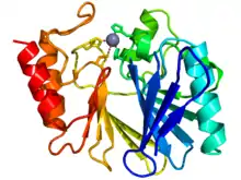 Cartoon diagram of the crystallographic structure of a zinc metallo-beta-lactamase from bacillus cereus (N-terminus = blue, C-terminus = red). The catalytic zinc ion is depicted as a grey sphere.