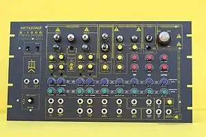 Metasonix produces audio effects and synthesizers using atypical vintage vacuum tubes. Metasonix modules are considered high-end in pricing and consume large amounts of power to create highly distorted sounds.[6] Its products include the TM-7 "Scrotum Smasher",[7] the TM-3 voltage-controlled oscillator,[8] the TM-6 filter,[9] the TX-1 "Agonizer",[10][11] the TX-2 "Butt Probe",[12] the TS-21 waveshaper,[13] the S-1000 Wretch Machine,[14] and the G-1000 Fucking Fucker guitar amplifier.[15] Metasonix also sells a drum machine based on vacuum tubes, the D-2000.[6]