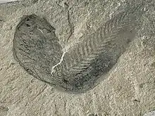 Whilst named after the Ediacaran organism Spriggina, later work has shown the two to be unrelated.[4] Metaspriggina is considered to represent a primitive chordate, possibly transitional between cephalochordates and the earliest vertebrates, albeit this has been questioned because it seems to possess most of the characteristics attributed to craniates. It lacked fins and it had a weakly developed cranium, but it did possess two well-developed upward-facing eyes with nostrils behind them.