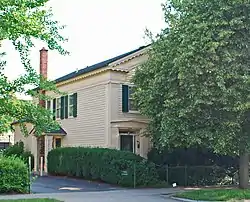 The former Methodist Episcopal Church Parsonage is a two-story, end-gable, Greek Revival structure with a 1+1⁄2-story rear wing. It is covered with clapboard. The front entrance is surrounded by sidelights and a transom light and capped with a cornice supported by Tuscan pilasters. The house has scalloped-edge eavesboard trim and by a highly stylized classical porch on the side entrance, indicating the transition from classical Greek Revival style to the more decorative styles of the later nineteenth century.[2]