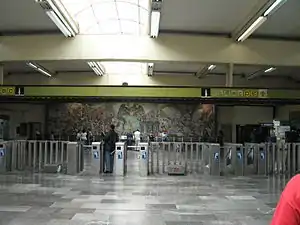 ![]() One of the murals painted on the Metro Universidad Station. It was painted by Arturo García Bustos and titled La Universidad en el umbral del siglo XXI and dated 1989. | |||||||||||