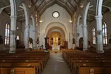 In 1868, under the direction of architect Francois P. Giraud, the cathedral was considerably enlarged in the Gothic style, the addition forming the existing nave. The carved stone Stations of the Cross were added in 1874. The striking stained glass windows were added in 1920.[3]