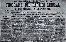 The Mexican Liberal Party (Spanish: Partido Liberal Mexicano, PLM) was started in August 1900 when engineer Camilo Arriaga published a manifesto entitled Invitacion al Partido Liberal (Invitation to the Liberal Party). The invitation was addressed to Mexican liberals who were dissatisfied with the way the government of Porfirio Díaz was deviating from the liberal Constitution of 1857.[6] Arriaga called on Mexican liberals to form local liberal clubs, which would then send delegates to a liberal convention.[7]