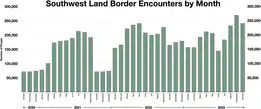 The number of migrant encounters reached a peak in December 2022, when Border Patrol reported over 220,000 apprehensions.[9] During the COVID-19 pandemic, Trump administration used Title 42 to expel migrants from the United States with a stated aim of reducing public health risks. Towards the end of 2022, a large camp of migrants had formed on the Mexican side of the border waiting for Title 42 to be lifted. The conditions they were living in were described as "dire."[10] As of September 2023, the number of migrant encounters has returned to a level near the peak, with about 9000 migrants apprehended daily.[11]
