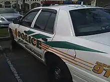 An MDPD Ford Crown Victoria Police Interceptor parked outside Hard Rock Stadium in the former livery.