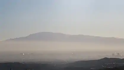 Mica Mountain view from the west, from 36 miles away in the Tucson Mountains. The small sub-peak on the right side of the mountain is Tanque Verde Peak, and Downtown Tucson can be seen in the foreground.