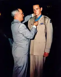 Daly was subsequently promoted to captain and, on August 23, 1945, was awarded the Medal of Honor.[2] Although still recovering from his wounds, for which he would continue to receive treatment until mid-1946,[4] he attended a ceremony at the White House where President Harry S. Truman formally presented him with the medal.[2] Daly is the second known graduate of Georgetown Prep to receive the Medal of Honor.