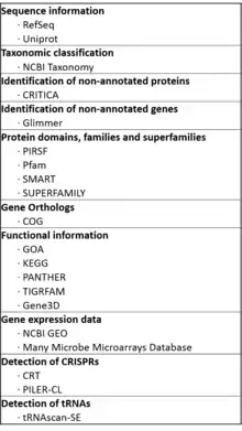 - ↑ Vallenet, D.; Belda, E.; Calteau, A.; Cruveiller, S.; Engelen, S.; Lajus, A.; Le Fevre, F.; Longin, C.; Mornico, D.; Roche, D.; Rouy, Z.; Salvignol, G.; Scarpelli, C.; Thil Smith, A. A.; Weiman, M.; Medigue, C. (2012). "Micro Scope--an integrated microbial resource for the curation and comparative analysis of genomic and metabolic data". Nucleic Acids Research. 41 (Database issue): D636–47. doi:10.1093/nar/gks1194. PMC 3531135. PMID 23193269.