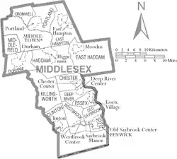 Map of Middlesex County, Connecticut showing cities, boroughs, towns, and CDPs