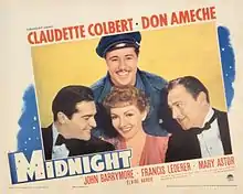 Midnight is a 1939 American screwball comedy film directed by Mitchell Leisen and starring Claudette Colbert, Don Ameche, John Barrymore, Francis Lederer, Mary Astor, and Elaine Barrie. Written by Charles Brackett and Billy Wilder and based on a story by Edwin Justus Mayer and Franz Schulz, the film is about an unemployed American showgirl stranded in Paris who is set up by a millionaire to break up his wife's affair with another man. In 2013, the film was selected for preservation in the United States National Film Registry by the Library of Congress as being "culturally, historically, or aesthetically significant".[1][2][3]
