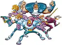 The Mighty Ducks in action, from left: Nosedive, Tanya, Grin, Wildwing (center), Mallory, Duke.