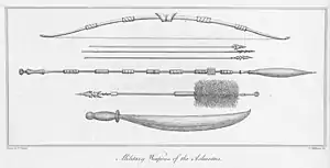 In battle, the army used advanced guard, main body, rear guard and right and left wings on the move. This organization enabled the Ashanti generals to maneuver their forces with flexibility. Reconnaissance and pursuit operations were carried out by the scouts.[16] The scouts were made up of professional hunters who used their skill of marksmanship to snipe at advancing enemy forces in response to detection by the enemy. This was executed often from a perch high in trees. In order to draw the enemy's force and compel them to reveal their positions in the jungle foliage, the scouts carried long wooden sticks with hooks on the end which they used to shake trees as if someone were in them. Scouts were precluded from an involvement in prolonged fighting. After exchanging a few shots with the enemy, they withdrew through the next wave of troops which was the advanced guards.[17] The advanced guard could also serve as initial storm troops or bait troops to get the enemy to reveal their position and strength. The gyase or personal guards protected the king or high ranking nobles on the battlefield. The rear guard however, might function for pursuit or as a reserve echelon. The two wings aided in the tactics of the Ashanti during battle through the encirclement of the opposing force or striking at the rear.[16]