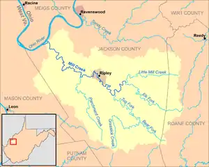 Mill Creek flows generally west-northwestward in a winding course through central and western Jackson County, through the city of Ripley, which may have been named for Harry Ripley, a traveling preacher said to have drowned in the creek in 1830.[9] Downstream of Ripley, the stream passes through a broad valley in the vicinity of the community of Cottageville[10] and flows into the Ohio River at the community of Millwood.[7] Approximately the lowermost 6 miles (9.7 km) of the stream consists of backwater caused by damming of the Ohio.[10] A commercial port facility is located on the creek near its mouth, handling limestone, sand, gravel, aluminum, and salt.[11]