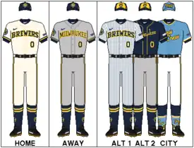 The set included a cream home uniform with "Brewers" and numbers in stylized block letters (a nod to Milwaukee's "Cream City" nickname), a home alternate pinstriped white uniform which shares the same features as the cream uniforms, a grey road uniform with "Milwaukee" and numbers in stylized block letters, and a road alternate navy uniform with "Milwaukee" in script letters and numbers in stylized block letters. The home sleeve patch features a navy baseball with stylized barley seams, while the road sleeve patch features the gold Wisconsin map with Cream City bricks and a baseball to represent Milwaukee's location. Initially, the gold-paneled navy cap was only used with the navy alternate uniform whereas the other uniforms were paired with the all-navy cap. However, beginning in 2022, the alternate gold-paneled cap was used exclusively on the road, with the all-navy cap worn only on home games. Both designs have the modernized "ball-in-glove" logo in front.[13]