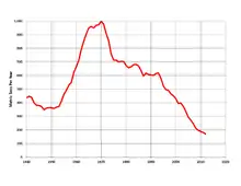 The South African mining industry is frequently criticized for its poor safety record and high number of fatalities but conditions are improving. Total fatalities were 533 in 1995 and had fallen to 199 in 2006.[53] Between 1984 and 2005, more than 11 000 mine workers died.[54] The overall fatality rate in 2006 was 0.43 per 1,000 per annum but this hides some important differences. The gold mining rate was 0.71, platinum mining was 0.24 and other mining was 0.35. (For comparison, the rate in the Sixties was around 1.5—see any Chamber of Mines Annual of the period). The reason for the difference is quite clear; the gold mines are much deeper and conditions are both more difficult and dangerous than on the shallower platinum mines.