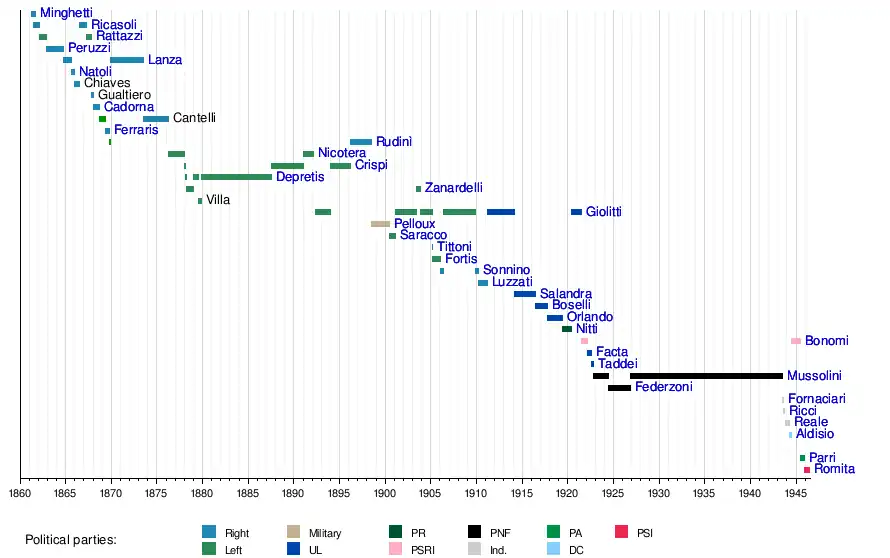 10 March 1896 | 29 June 1898 | 2 years, 111 days | Historical Right | Di Rudinì II·III·IV·V | ||