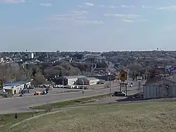 The elevation of the river at the city center is 1,540 feet (470 m) above sea level.[20] The valley sits 160 feet (49 m) below the surrounding plains; the elevation at the Minot International Airport on North Hill is 1,716 feet (523 m). The city has several small horseshoe-shaped oxbow lakes within its limits near the river, created by the Mouse's meandering course.