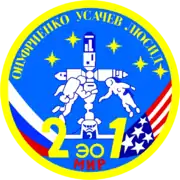 Mir EO-21 was a long-duration mission aboard the Russian Space station Mir, which occurred between February and September 1996. The crew consisted of two Russian cosmonauts, Commander Yuri Onufrienko and Yury Usachov, as well as American astronaut Shannon Lucid. Lucid arrived at the station about a month into the expedition, and left about a week following its conclusion; NASA refers to her mission as NASA-2.[4] She was the second American to have a long-duration stay aboard Mir, the first being Norman Thagard, as a crew member of Mir EO-18; he stayed on the station for 111 days.[5] Some sources refer to her mission as Mir NASA-1, claiming that she was the first American to have a long-duration stay aboard Mir.[6]