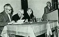 The presidential board of the International Conference "Krapina early man and hominid evolution", Krapina, Croatia, Sept. 17. 1976. From the left: Mirko Malez, S. Nežmahen and J. Kallay. At the lectern Lj. Barić.