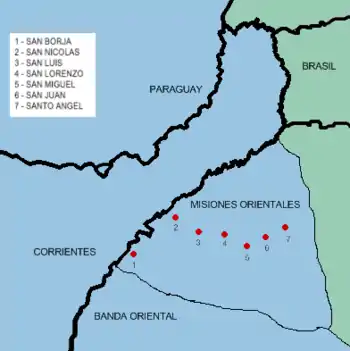 The Misiones Orientales (Spanish pronunciation: [miˈsjones oɾjenˈtales], lit.'Eastern Missions') or Sete Povos das Missões/Siete Pueblos de las Misiones (Portuguese pronunciation: [ˈsɛtʃi ˈpɔvuz dɐz miˈsõjs], lit.'Seven Towns of the Missions') is a historic region in South America, in present-day Rio Grande do Sul, the southernmost State of Brazil.
