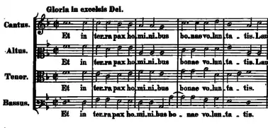 In the Gloria movement, Palestrina introduces textural contrasts, carefully balancing chordal and imitative textures. The opening motif is sung simultaneously through all four voices and is three bars long. The lengthy text passes quickly with syllabic writing and "telescoping"; the only repetition comes at the end, once again with a bass sequence.
