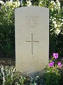 Even in the 21st century, the remains of missing combatants are recovered from the former battlefields of the Western Front every year.[19] These discoveries happen regularly, often during the course of agricultural work or construction projects.[20][21][22][23][24][25][26] Typically, the remains of one or several men are found at a time. However, occasionally the numbers recovered are much larger e.g. the mass grave at Fromelles (excavated in 2009) which contained the skeletal remains of no less than 250 Allied soldiers.[27][28][29][30] Another example is the excavation which took place at Carspach (Alsace region of France) in early 2012, which uncovered the remains of 21 German soldiers, lost in an underground shelter since 1918, after being buried by a large-calibre British artillery shell.[31] Regardless, efforts are made to identify any remains found via a thorough forensic examination. If this is achieved, attempts are made to trace any living relatives. However, it is frequently impossible to identify the remains, other than to establish some basic details of the unit they served with. In the case of British and Commonwealth MIAs, the headstone is inscribed with the maximum amount of information that is known about the person.[32] Typically, such information is deduced from metallic objects such as brass buttons and shoulder flashes bearing regimental/unit insignia found on the body. As a result, headstones are inscribed with such information as "A Soldier of The Cameronians" or "An Australian Corporal" etc. Where nothing is known other than the soldier's national allegiance, the headstone is inscribed "A Soldier of The Great War". The term "Sailor" or "Airman" can be substituted, as appropriate.