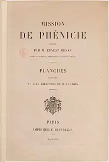 The Mission de Phénicie was the first major archaeological mission to Lebanon and Syria. It took place in 1860-61 by a French team led by Ernest Renan. Renan was entrusted with the mission in October 1860, after French interest had been sparked by the 1855 discovery of the Sarcophagus of Eshmunazar II.[1]