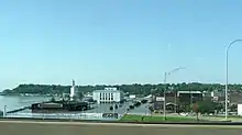 River stages at the Quad Cities of Iowa and Illinois were above major flood stage for 51 days exceeding the previous record of 31 days set in 2001.[23] The river remained above flood stage levels for over 96 days.[24] The crest of 22.7 feet (6.9 m) on 2 May 2019 was nearly a tenth of a foot above the record stage set in 1993. Temporary flood barriers failed on 30 April 2019 flooding portions of downtown Davenport, Iowa.[23][25][26]