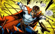 Around the same time during the fight with Mordru, Mr. America helped his team in the fight against the Black Lanterns in New York City. He expressed willpower as he fought against a Black Lantern. Mr. America growled to it, "Come on, you monster". He was later seen defeated and being held by Flash, who sped him to safety at S.T.A.R. Labs.[12]