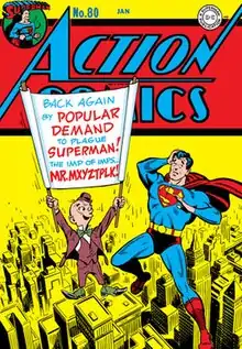 Mister Mxyztplk (the original spelling) was introduced in the Golden Age as an imp from the "fifth dimension".[5] Not being bound by physical laws, he can do things that seem to be magical. In his first appearance, Mxyztplk wreaks havoc across Metropolis by using his powers to pull all manner of pranks, first pretending he got hit by a truck and killed, then increasing his weight when the ambulance gets there and waking up to shock them. What is more, he destroys Superman's worldview of himself. Mxyztplk jumps out a window, fooling Superman into thinking he is committing suicide. When he appears unharmed, an astonished Superman exclaims, "I-I thought I was the only man who could fly!!" He gives the Mayor the voice of a donkey, and then blows papers over the town. Mxyztplk soon tells Superman that he is a jester in his home dimension, explaining why he uses his powers to play practical jokes, but one day he finds a book that tells him of this world.