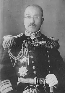 Following the conclusion of the war, he was ennobled with the title of baron under the kazoku peerage system. In 1906, he commanded the Ryojun Guard District[5] From 1909-1911, he was placed in charge of reconstruction of the Maizuru Naval District.[6] The operational area of Maizuru encompassed his home town of Hikone, which has no access to the sea. He went on the reserve list in 1913 as full admiral and died in 1921.