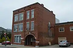 It is a three-story masonry wall and wood-frame building, with a Romanesque brick arch entry as its most salient feature. The brickwork is in common bond with a quoin detail every sixth course. It was designed and built by Ed Dishman.[2]