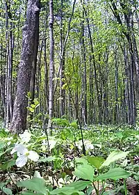 A representative stand of deciduous forest near Peterborough with white trilliums in flower.