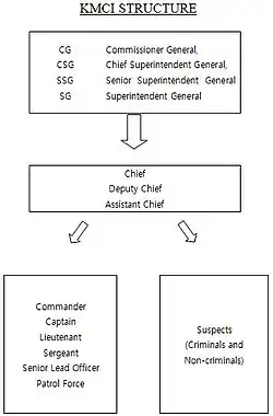 KMCI basically follows the system of Department of Justice in United States. Committees students can take are Federal Bureau of Investigation, US Marshals, Drug Enforcement Administration, Bureau of Alcohol, Tobacco, Firearms and Explosive, or Department of Homeland Security. Each student will work as police designated as a Lieutenant, Sergeant, or Commander, or will work as suspects defending themselves as innocent. Participants (if they are suspects) will typically receive a criminal case ahead of time, which includes the facts of the crime, their roles, alibis and pieces of evidence. Students taking roles as suspects must prepare and memorize the cases given to them. During model crime investigation sessions, participants working as Police, not knowing who the actual criminal(s) is (are), must gather these pieces of evidence through investigating, interrogating and interviewing suspects in order to find out who the offender(s) is(are).