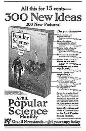 - ↑ "September's Harvest Of Important Books". The New York Times. August 29, 1915. p. BR312. "The Popular Science Monthly has been bought by the Modern Publishing Company of New York City and consolidated with The World's Advance, formerly Popular Electricity. The two magazines will be merged under the title of The Popular Science Monthly, beginning with the November issue. Waldemar Kaembffert for a longtime editor of the monthly will continue in that position."