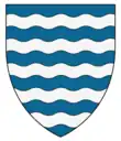 The Mogorović's coat of arms can be followed since the 15th century with the seals which used noble members of the tribe. The main motif of the shield is silver bars representing the river, which were flat, transversal, or like the most, wavy. The number of bars is undefined, ranging from two up to seven, intermediate being four or five,[11] possibly indicating rivers around which the tribe lived.[8][9] The shield color according to the coat of arms of Petričević-Hreljac branch from 1590 was azure, while the Babonožić's branch coat of arms from 1622 which had a silver shield and azure bars is most probably wrongly interpreted because such coloring is against heraldry practice. It had only slight variations, rarely with an addition of a lion with a sabre (Mogorić), griffin (Babonožić), or six to eight-pointed star (Gojčić, Kobasić). The armor's helmet and its mantle are unknown.[11]