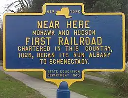 On December 28, 1825, Schenectady County resident (Duanesburg) George William Featherstonhaugh (pronounced Fenshaw[2]) ran a newspaper notice announcing the formation of the Mohawk & Hudson Rail Road Company. The intention was to bypass the Erie Canal between Albany and Schenectady, cutting time for the trip from a whole day to under one hour.[3] The Mohawk & Hudson became the first chartered railroad in New York State on April 17, 1826.