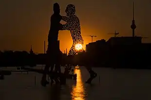 30 m Molecule Man sculpture on the Spree River, Berlin, Germany, viewed from Treptowers.[1]