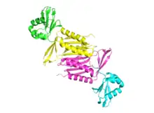 Molybdopterin synthase is heterodimeric and coded for by the MOCS2 gene.[3] Genetic deficiencies of enzymes such as MPT synthase, which are involved in MoCo biosynthesis, lead to MoCo deficiency, a rare disease that results in severe neurological abnormalities.[4][5][6][7]