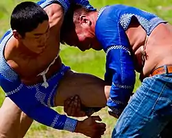 Mongolian wrestling, known as Bökh (Mongolian script: ᠪᠥᠬᠡ; Mongolian Cyrillic: Бөх or Үндэсний бөх), is the folk wrestling style of Mongols in Mongolia, Inner Mongolia and other regions where touching the ground with anything other than a foot loses the match.[1] Bökh means "firmness, reliability, vitality, wrestler", from Mongolic root *bekü "firm, hard, solid; fighter, strong man"[2] possibly from Turkic *böke "warrior" < "big snake".[3] Wrestling is the most important of the Mongolian culture's historic "Three Manly Skills", that also include horsemanship and archery. Genghis Khan considered wrestling to be an important way to keep his army in good physical shape and combat ready. The court of the Qing dynasty (1646–1911) held regular wrestling events, mainly between ethnic Manchu and Mongol wrestlers. There are several different versions, Mongolian, Buryatian (in the Buryatia of Russia), Oirat and Inner Mongolian.