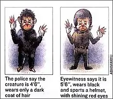 In May 2001, reports circulated in New Delhi, India concerning a monkey-like creature that attacked people at night.[4] Eyewitness accounts were often inconsistent, but usually described the creature as about four feet (120 cm) tall,[5] covered in thick black hair, with a metal helmet, metal claws, glowing red eyes and three buttons on its chest. Some reports also claim that it wore roller-skates.[6] Others, however, described the Monkey-man as having a more vulpine snout, and being up to eight feet tall, and muscular; it would leap from building to building. Over 350 sightings of the Kala Bandar were reported, as well as around 60 resulting in injuries.[7] Police released artist's sketches of eyewitness accounts in an attempt to catch the creature. Two (by some reports, three) people reportedly died when they fell from the tops of buildings or down stairwells in a panic caused when they thought they were under attack.[5]