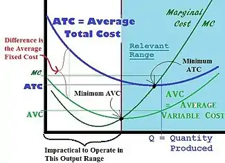 Marginal cost (MC) relates to the firm's technical cost structure within production, and indicates the rise in total cost that must occur for an additional unit to be supplied to the market by the firm.[1] The marginal cost is higher than the average cost because of diminishing marginal product in the short run.[1] It can be calculated as , where .[2][4]